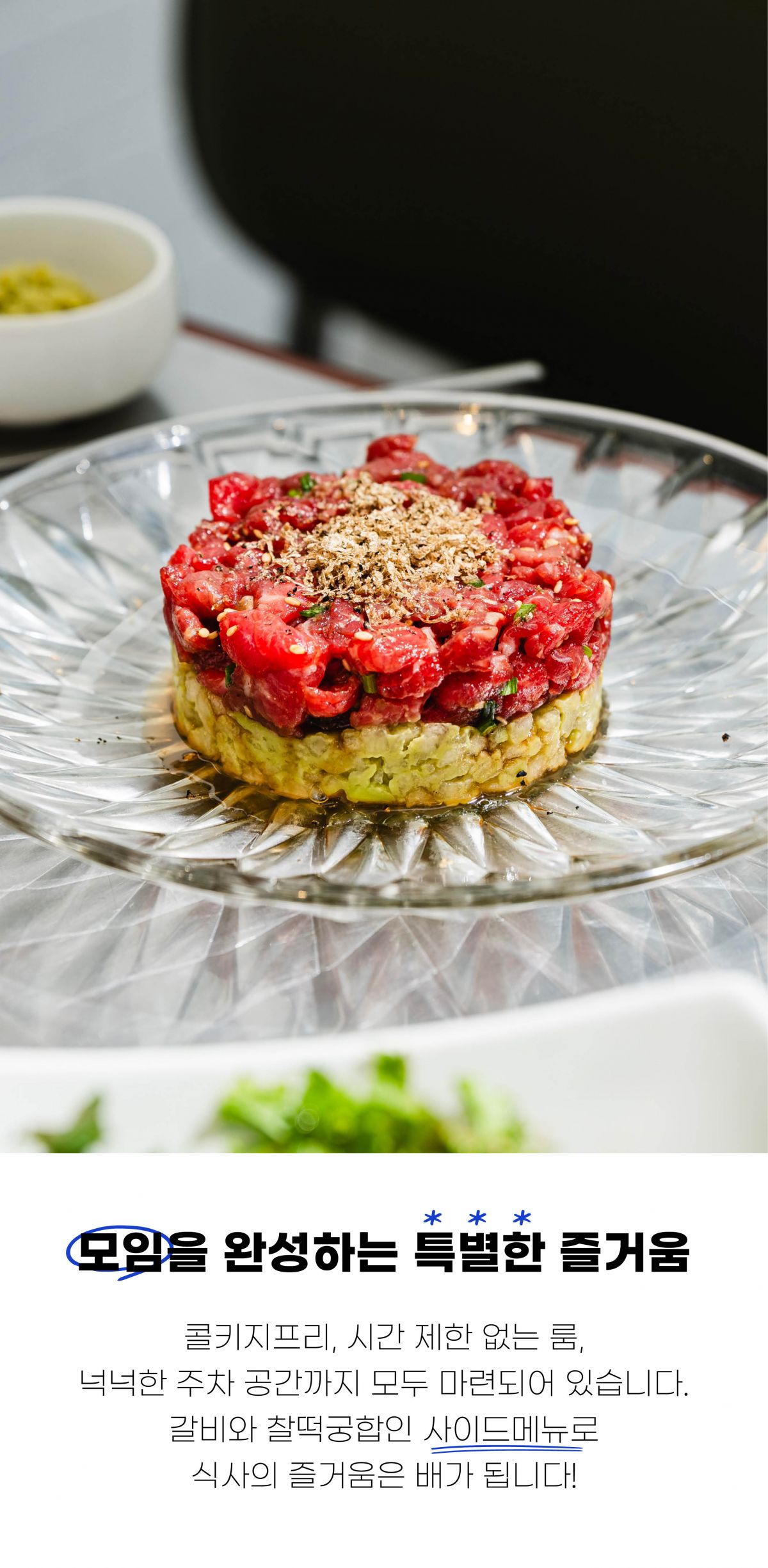 전문 그릴링 서비스로 손님은 오직 소중한 만남과 대화에 집중할 수 있으며, 넓은 홀과 프라이빗 룸이 준비되어 다양한 모임에 최적화되어 있습니다.